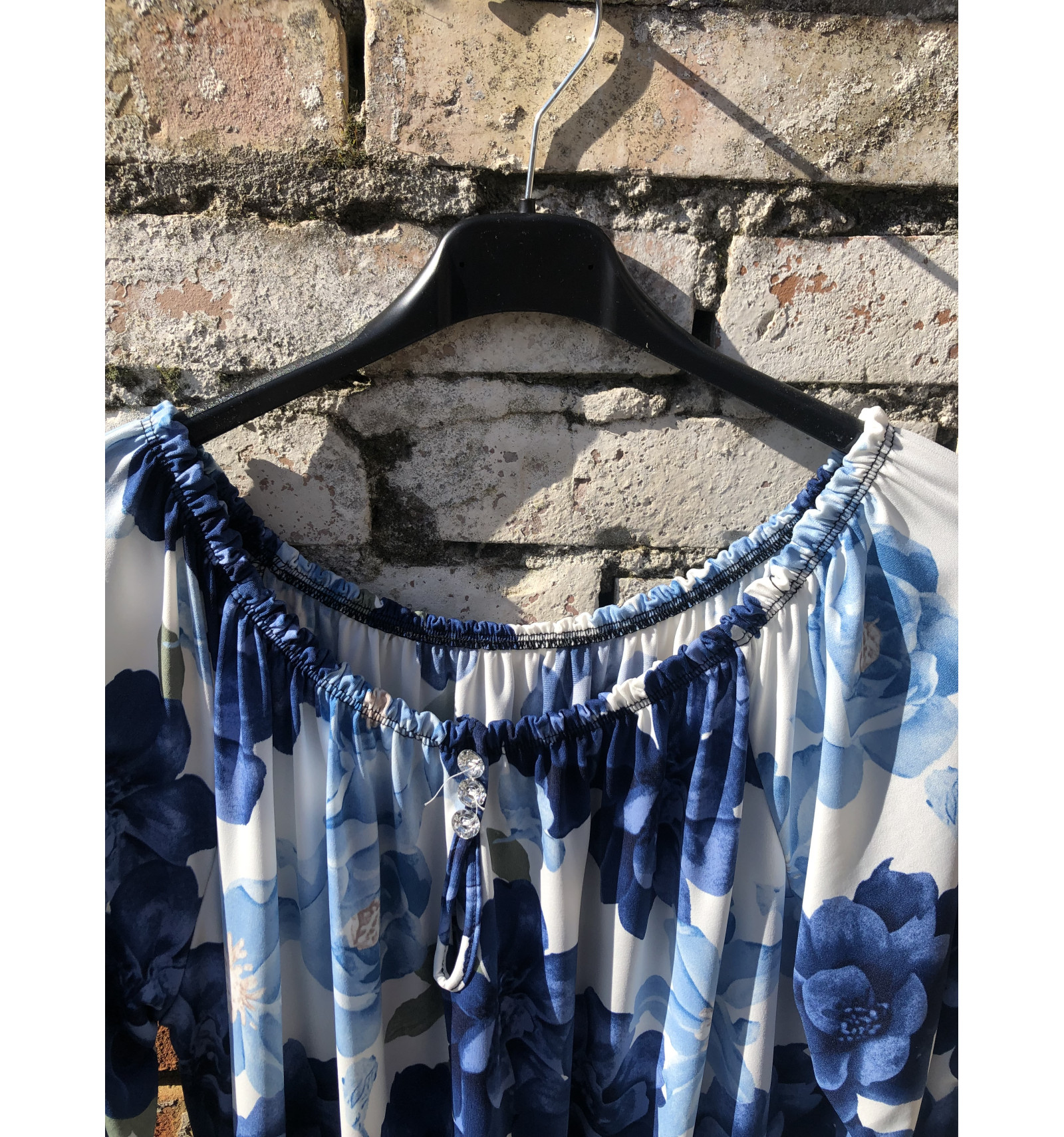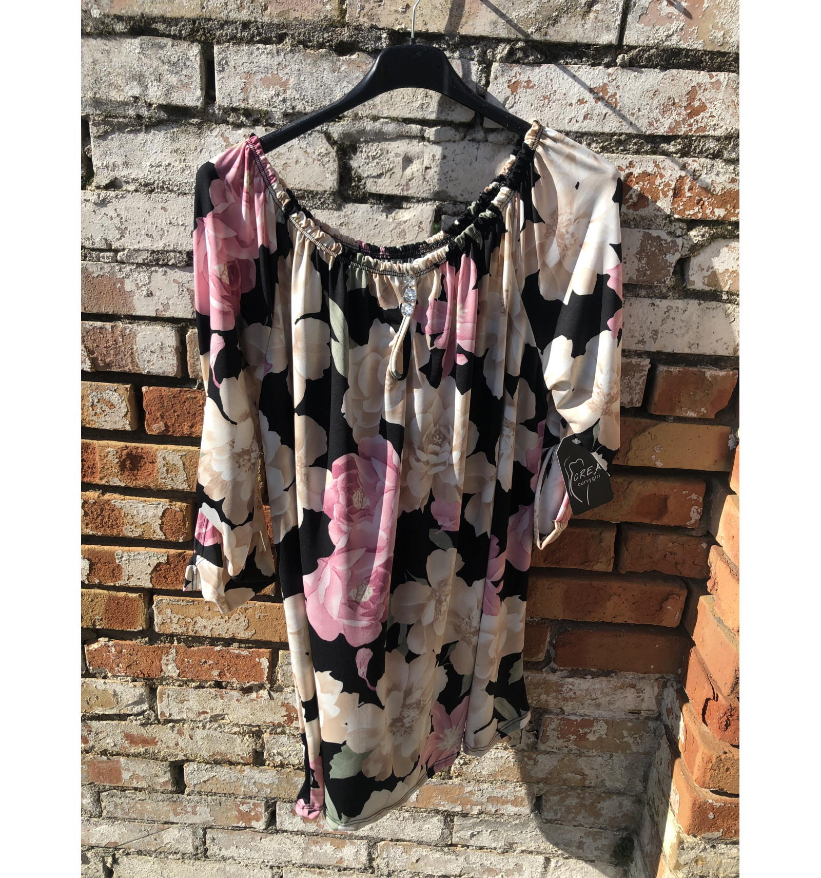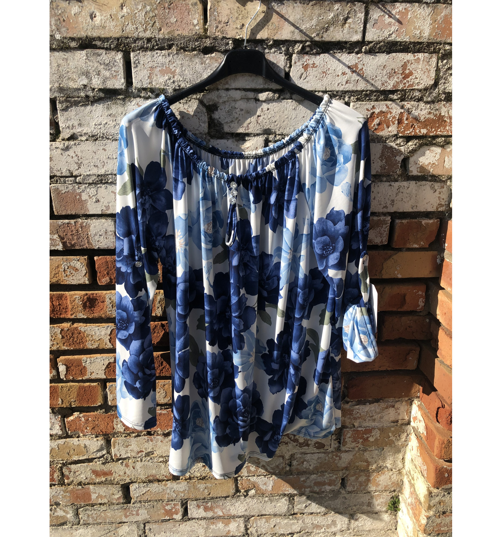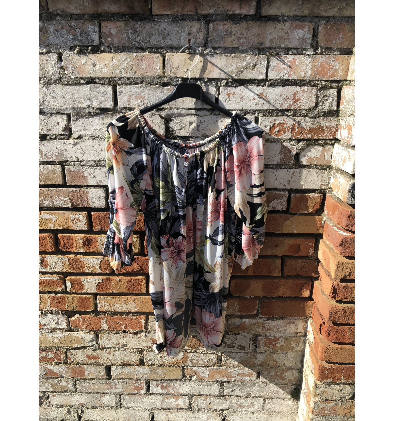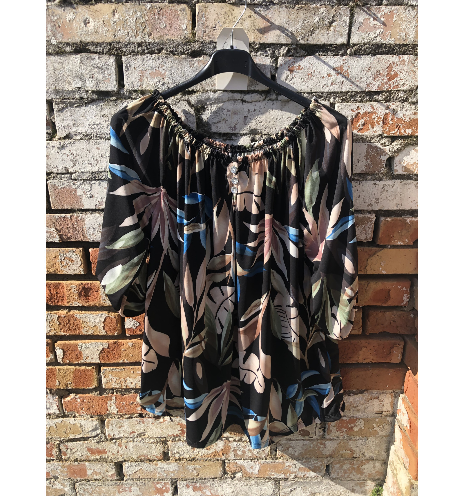 MAGLIA IN VARIE FANTASIE A FIORI E FOGLIE IN MORBIDO JERSEY, CON SCOLLO ELASTICO ALL'AMERICANA. IN TESSUTO AL 95% DI VISCOSA. SELEZIONARE LA LETTERA DESIDERATA: - A : NERO/SABBIA/OTTANIO FOGLIE - B: BLU/CICLAMIN FOGLIE - C: AVORIO/ROSA/GRIGIO FIORI - D: NERO/SABBIA/ROSA FIORI - E: BLU/AZZURRO/ FIORI